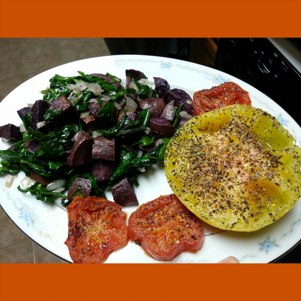 Cut the heirloom tomato in half, scoop out the seeds and turn cut side down to “drain out”. Cut the Roma tomatoes in threes and let drain out on a paper towel. On a medium heat setting, heat the coconut oil then add the diced potatoes and cook for about 5-8 minutes. Add diced onions and garlic and cook for another minute or two. Add the chopped Russian Kale, a little sea salt & pepper and cook for another few minutes. Meanwhile, cover the tomatoes with EVOO (extra virgin olive oil) or try MCT oil…I didn’t have any EVOO….and it worked great! Sprinkle with a little sea salt & pepper and rosemary…again, I was out of rosemary so I used basil & oregano…place the tomatoes on a baking sheet cut side up and into the oven set on a hi broil for about 3-5min.