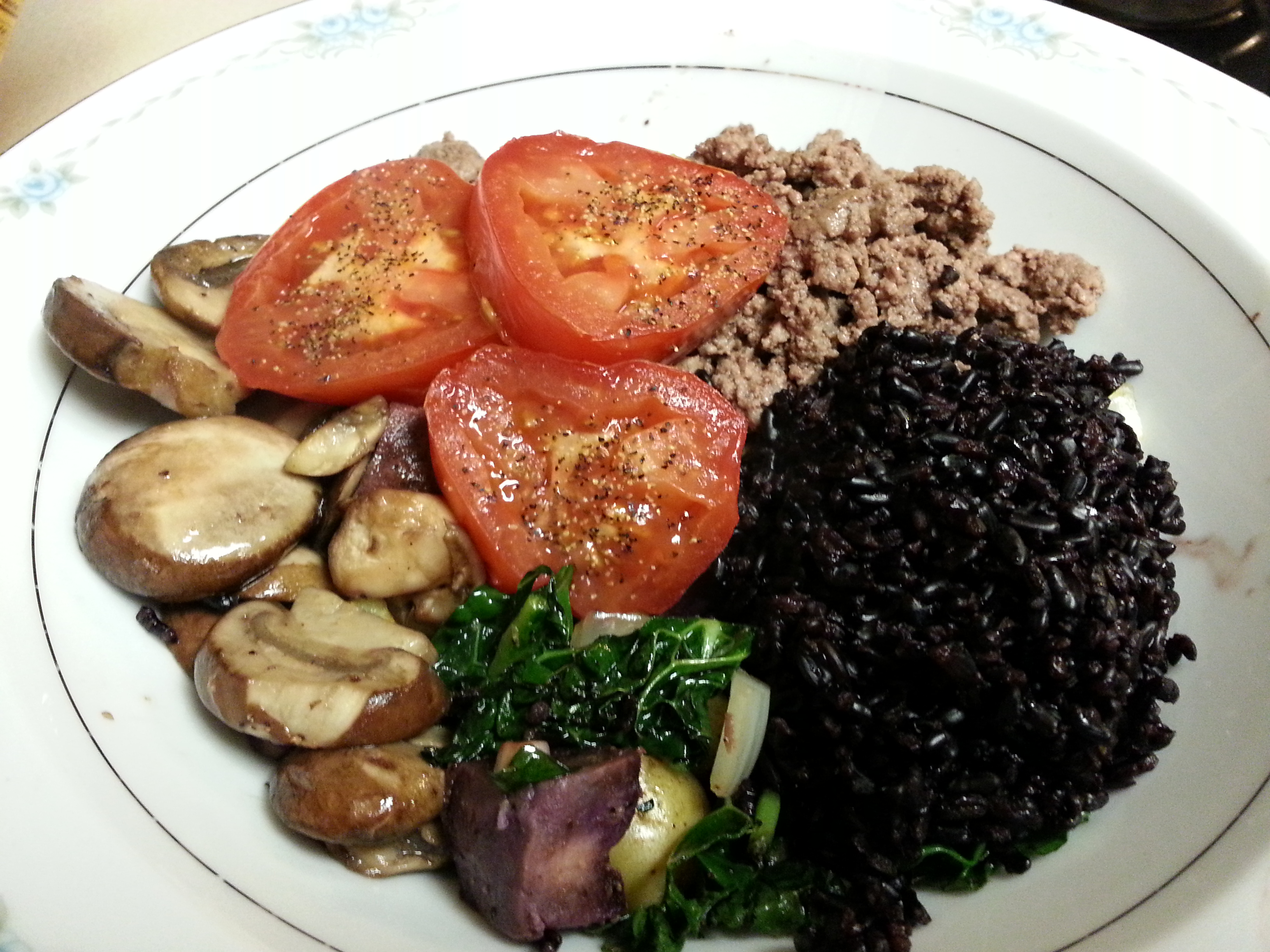 Heirloom forbidden rice, I’m diggin’the black rice! It’s got kind of a sticky quinoa texture and a taste similar to Jasmine rice.  1c dry yields 3c cooked so this stuff will last!