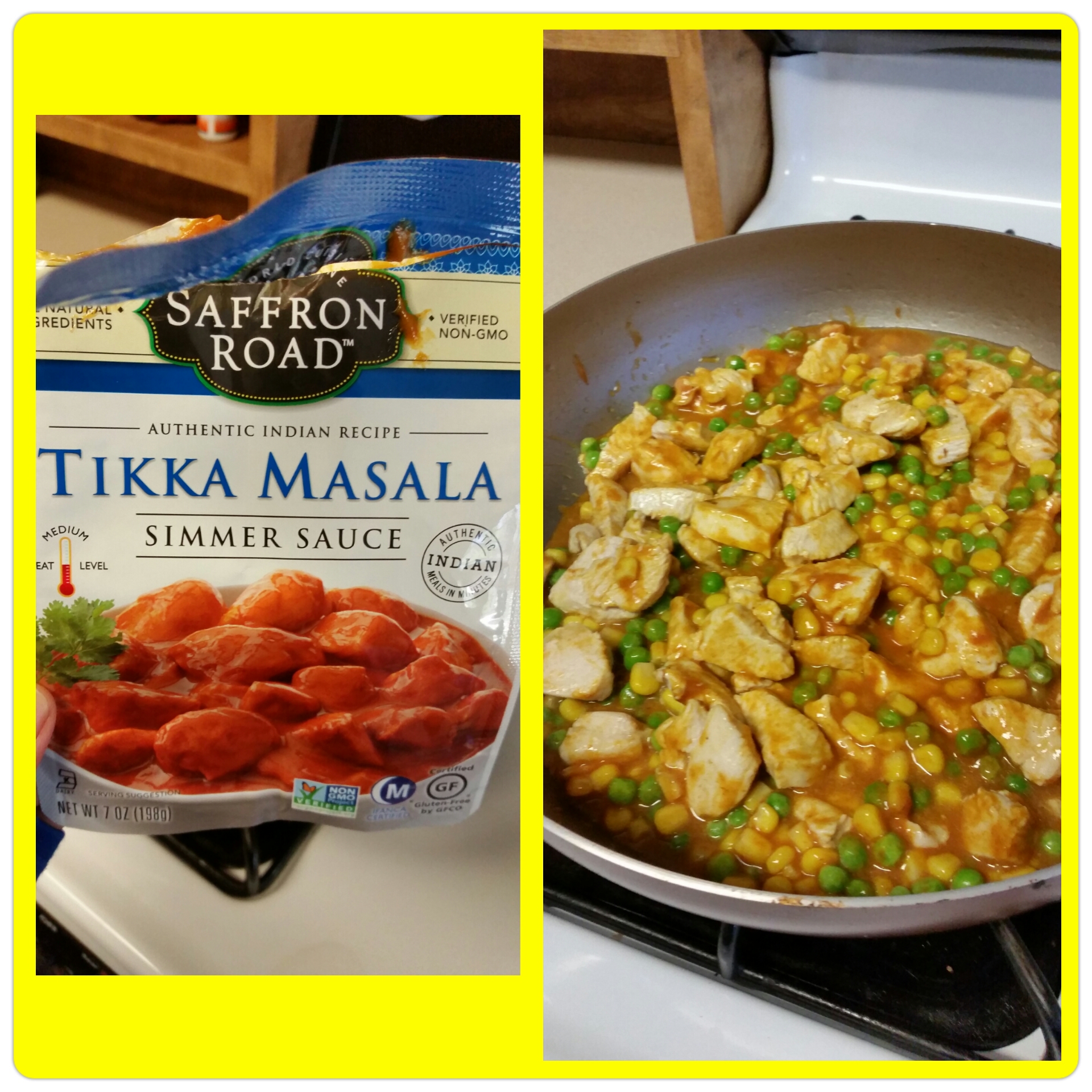 Tried a new simmer sauce, “Tikki Masala” by Saffron Road. I diced and cooked chicken breast in coconut oil, then added 1c of frozen peas, 1c of corn and the sauce.  This fast and easy meal makes ~4 servings.