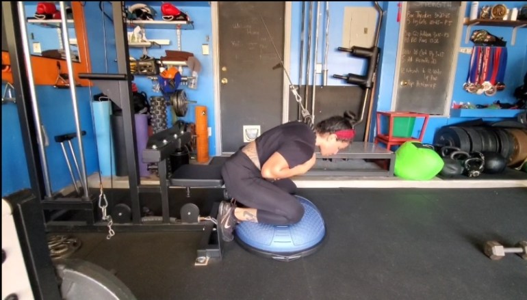 DB Floor Chest Press, DB Shoulder Press, DB Tricep Kickback & Cable Crunches on BOSU